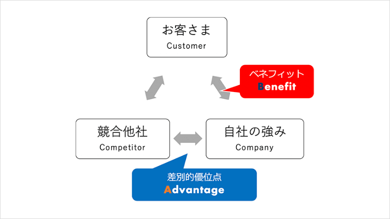 - 3C:Customer(お客様)/ Competitor(競合)/ Company(自社の特徴・強み)